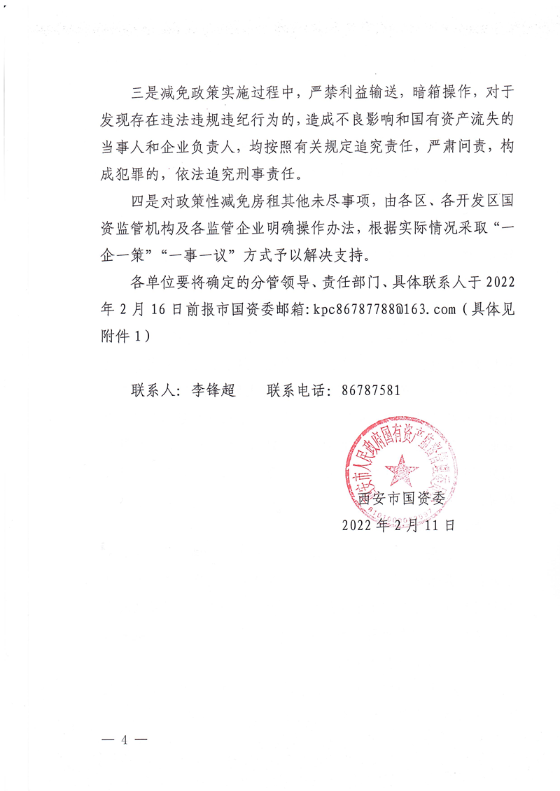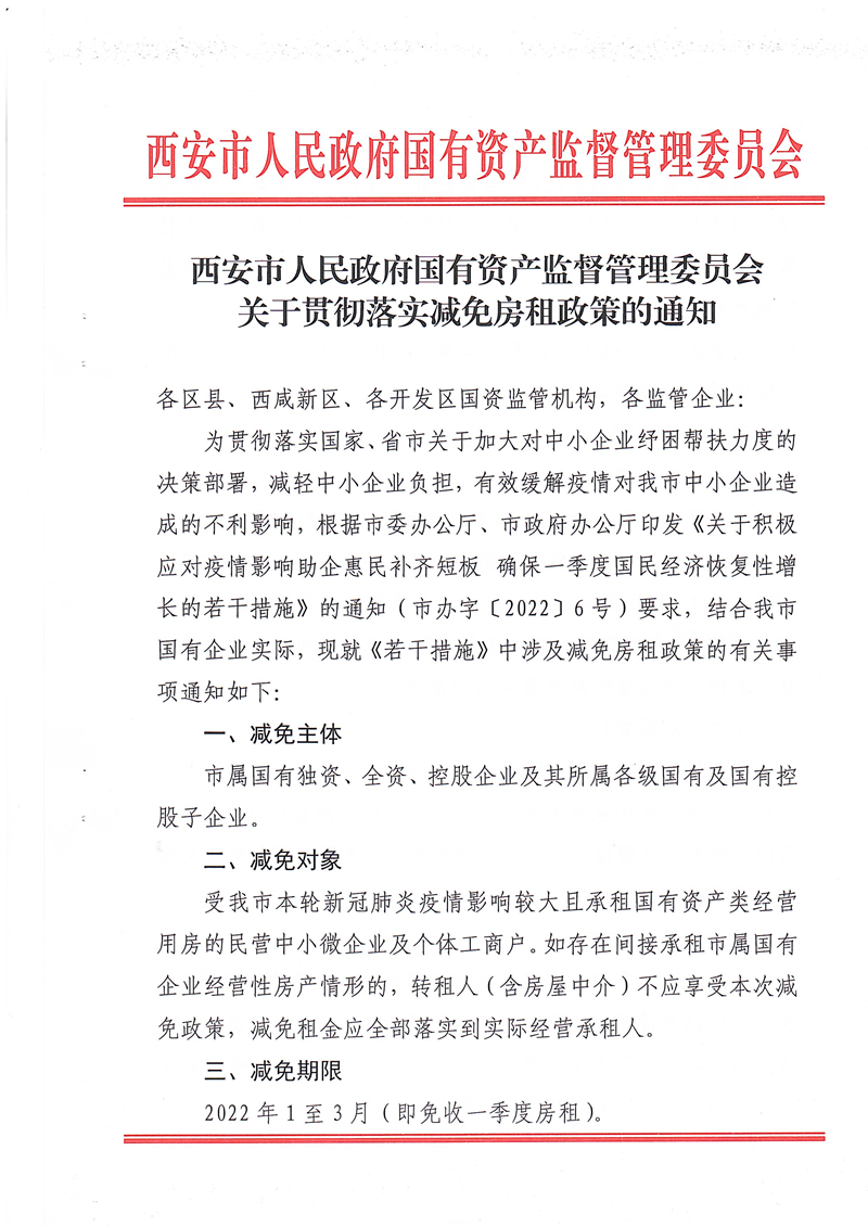 西安市國資委關(guān)于做好減免國有企業(yè)房屋租金工作有關(guān)事項(xiàng)的補(bǔ)充通知