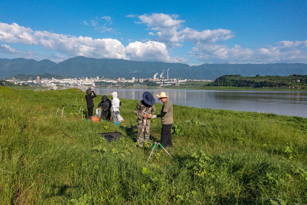 在位于重慶的中國科學(xué)院三峽庫區(qū)水土保持與環(huán)境研究站,中國科學(xué)院成都山地所科研人員在庫區(qū)消落帶上開展相關(guān)監(jiān)測(cè)(2023年7月5日攝,無人機(jī)照片)。新華社記者 黃偉 攝