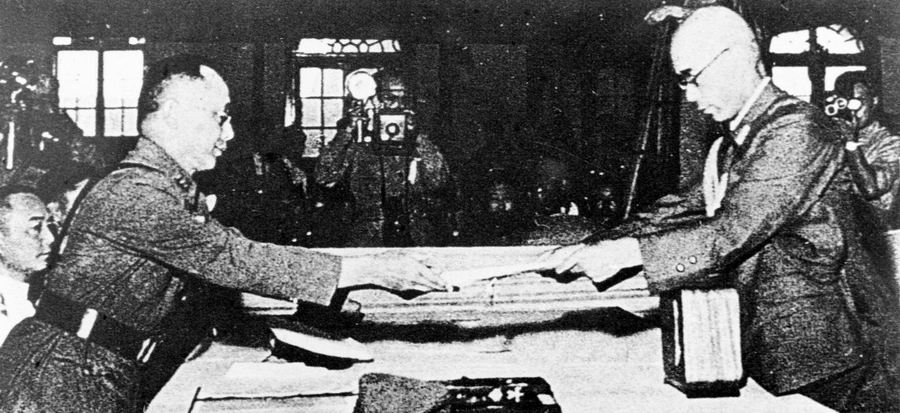 1945年9月9日,何應(yīng)欽(左)在南京代表中國政府接受侵華日軍總參謀長小林淺三郎遞交的侵華日軍總司令岡村寧次簽署的投降書。新華社
